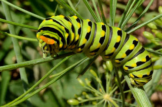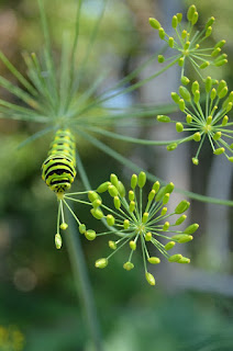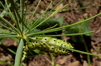 Ecological notes: I read two things about these caterpillars. The first is that they can decimate a patch of dill when their populations erupt, and they often do, in near biblical proportions (exaggeration, but warranted for gardeners with an affection for dill; in the photo to the right you can see all the “missing” flowers at the tips of the pedicels from where the munchkin gnawed them off). Many of their would be control-mechanisms, like birds, are thwarted by what’s called an osmeterium, a weird little forked appendage at the front of the thorax (just behind the head). When provoked the caterpillar will rear up dramatically on its prolegs extend the osmeterium and emit a most rank and foul odor. Well, I had to test this out myself. I didn’t smell anything except freshly cut dill (you can see a bunch of flowerless stalks that the caterpillar had nipped off), but what a beautiful treat! Perhaps the vibrant orange signals as a warning before emitting the odor, much like a skunk stomps its feet, chatters its teeth, and does a handstand before finally spraying an approaching predator.
