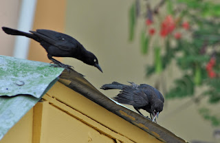 Notas Ecológicas: This is an adult with a juvenile that have been hanging around the rooftops adjacent to my apartment. You can tell the young one by the slightly ruffled look of its feathersand the fact that (as you can see in the above photos and the videos below) it was squawking and opening its mouth, crying out for some food. See videos below for the actual feeding event! One thing you can’t notice in these photos (but I welcome you to Google search other images of them) is that when they land and are walking around, their tail feathers seem to cluster together and fan upwards like a little rutter instead of laying flat. It was really noticeable at first, and if I can get another photo in that position, I will add it to this post. There is an endemic subspecies of Grackle in Puerto Rico (Quiscalus niger brachypterus), but I have no way yet of knowing if this is what I am seeing. Like many other islands in the Antilles, each tends to have a number of endemic species – for birds, they tend to be subspecies, but in the case of terrestrial reptiles and amphibians, the amount of endemics is very high, because of the geographic isolation of each island – which, of course, is less of an obstacle for birds. It is interesting to note that in several lists of bird species for Puerto Rico, there are about 350 observed. Vermont, by contrast (which is about 3x larger, but certainly not as bio-geophysically diverse) has around 371 observed.
