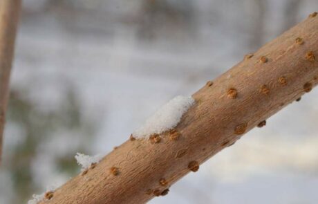 Horizontally peeling papery bark is characteristic of the Betula genus (birches). Some don’t really peel (gray birch and sweet birch), while others peel in large sheets (paper birch) or thin strips (yellow birch), but each has a distinctly smooth and papery quality. Each sheet of paper corresponds to a year of growth. Common buckthorn has dark gray bark that peels into thick, rough strips, and pin cherry – like other cherries – has smooth bark with prominent lenticels, but, unlike the other cherries, it can be peely at maturity. Staghorn sumac has extremely thin bark and once it dies can peel into papery strips, reminiscent of buckthorn or some birches.