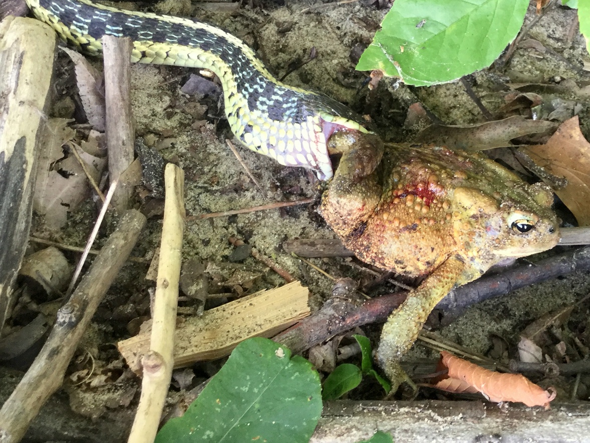 Oh, how my heart went out to that poor toad. And what a beast of a toad, easily one of the largest toads I’ve ever seen. We surmised that it was puffing out its chest to make it difficult for the garter snake to swallow it any further. We watched the struggle unfold for about 10 minutes before we had to leave. Perhaps the most striking realization that I had was that toads don’t have facial expressions, a simple observation but so dramatic when I realized that this toad was having perhaps the most dramatic and terrifying experience of its life and it’s face was totally stoic, or rather unchanged. As we were leaving someone called us back for the culmination of the struggle. The snake had decided it had bit off more than it could chew and released the toad from its grasp. A sad day for snake enthusiasts, a great day for toad-a-philes, and a fascinating, but morally neutral day for ecologists :)