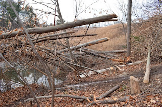 Walking the perimeter, they’ve done substantial work since they moved in about a month and a half ago. Looking at the northern border of the detention pond, there’s no doubt that beavers are skilled at what they do. Each of the few dozen trees they’ve felled are all in perfect alignment. The one thing they didn’t account for was the chainlink fence. Hopefully when the big red maple still standing in the background comes down it will crush the fence and make some of those trees a bit more accessible for the beavers.