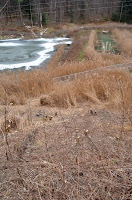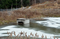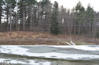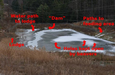 What: The above photo I took on November 28. The pond started to freeze over on the 23rd with a thin sheet. Over the first few days the beavers were actively maintaining openwater. They’ve since stuck to maintain some exists along the edge of the water as well as a few openings in the middle of the water. The darker “C” shape in the middle is where the water is deeper and therefore warmer. The little snow fall we’ve gotten has melted into the ice. There’s more snow on the right side of the pond (it’s the south side and is shaded by a thick wall of white pines). The lodge is constructed on the bank. It’s unclear if they’ve also dug into the bank while constructing it.