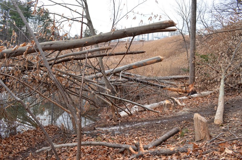 Walking the perimeter, they’ve done substantial work since they moved in about a month and a half ago. Looking at the northern border of the detention pond, there’s no doubt that beavers are skilled at what they do. Each of the few dozen trees they’ve felled are all in perfect alignment. The one thing they didn’t account for was the chainlink fence. Hopefully when the big red maple still standing in the background comes down it will crush the fence and make some of those trees a bit more accessible for the beavers.