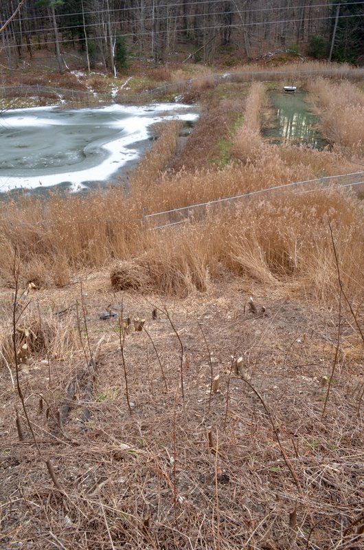 What: The above photo I took on November 28. The pond started to freeze over on the 23rd with a thin sheet. Over the first few days the beavers were actively maintaining openwater. They’ve since stuck to maintain some exists along the edge of the water as well as a few openings in the middle of the water. The darker “C” shape in the middle is where the water is deeper and therefore warmer. The little snow fall we’ve gotten has melted into the ice. There’s more snow on the right side of the pond (it’s the south side and is shaded by a thick wall of white pines). The lodge is constructed on the bank. It’s unclear if they’ve also dug into the bank while constructing it.