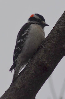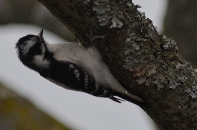 Hairy woodpeckers (coming tomorrow) can be really difficult to tell the apart from downys. A hairy woodpecker is beefed up downy woodpecker (hairys are about the size of robins, downys are just slightly bigger than titmice). My old roommate, and fantastic naturalist, Emily Stone, used the following mnemonic: