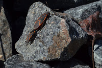 Once I spotted the culprit (actually hundreds and hundreds of culprits) my interest was piqued. I’d watched some type of fly by the lake mating yesterday, with their rears touching and the boxelder bugs took the same posturing. The males are the larger of the two and have much brighter orange bellies. They more or less dragged the females over the rocks. Pairings seemed to last anywhere from 2 to 5 minutes or so.