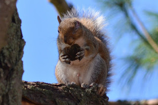 Many of the females had ragged ears or other signs of the hazards of living. Males with aggressively court females and defend access to them (see my post from May 7 for more on that). I assume that many of the scars on the squirrels were from squirrel-to-squirrel interactions during breeding season. Once we had the chance of watching a red-tailed hawk swoop down and steal a squirrel off the ground. The hawk was successful and we then watched it eat the squirrel. I imagine that not every attempt ends this way and that many a squirrel lives to climb another tree, hide another acorn, a scar as wide as a talon bears witness to the fact that squirrels are prey.