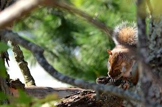 Ecological notes: The squirrel was eating a walnut from our tree. This has definitely been a bumper year for walnuts and a red squirrel (Tamiasciurus hudsonicus) has been fiercely defending it, trying in vain to fend off the grays from stealing a snack.