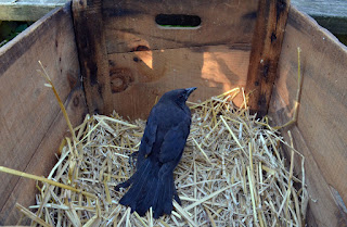 Ecological notes: We’ve been feeding the grackle (of unknown gender, and we may never know its gender) chicken feed soaked in water along with scrambled eggs. Apparently, like kangaroo rats and many other denizens of the desert, baby birds get all of their water from metabolizing food (desert animals that do this are called xerocoles). The formula for photosynthesis is