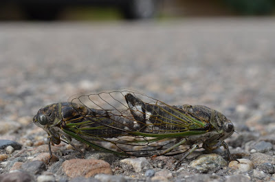 Aptly named, the dog-day cicadas are among the later insects to start making their buzzy wing-flapping noises. The related periodic cicada (Magicicada sp.) has a life cycle that results in outbreaks over large geographic areas every 13 or 17 years, depending on species. Both numbers are prime numbers and probably prevent repeated overlap with any would-be predators that might be on 2,3, 4, or 5 year population cycles (a predator with boom populations every 5 years would only over lap with the periodic cicadas every 85 years). Dog-day cicadas appear every year (and are therefore also known as annual cicadas). Not coincidentally, annual cicadas are predated upon by cicada killer wasps, while periodic cicadas are not known to be predated upon by any wasps. To hear a sampling of Tibicen cicadas check out Insect Singers