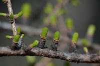 What: I’ve been watching the tamaracks (these are European Larch, Larix decidua) from a distance emerge into spring with this odd yellowish color. These little spur shoots have stacks of rings indicating previous year’s growth.