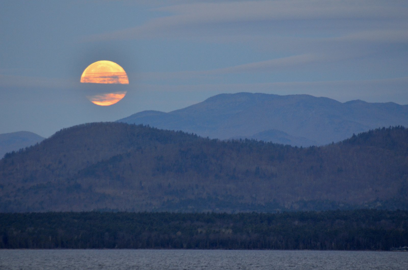 What: A beautiful full moon arcing over the sky at Shelburne Farms. The first two shots show moon rise (around 10pm). The thin layering of altocumulus clouds produced the perfect setting for a beautiful irridescent corona. Coronas form around the sun as well, but the sun’s bright light often obscures the optical light show. They are formed when light reflected off the moon is diffracted – when light bends around an object, which is different from refraction where light actually changes direction and speed – by individual water droplets. Thus the size of the aureole (the brighter inner white part) depends on the size of particles the light is bending around; the smaller the particles the larger the radius. The third image shows the moonset (around 6:15am).