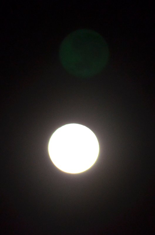 You can notice the slightest wavy part of the top of the moon, which is actually a shadow, revealing the ever-so-slightest crescent carved out of the moon. The chunk was on the trailing end of the moon’s path in the sky, indicating that the moon is waning. And, the photo below is a weird phenomenon -that offset green mirage of the moon – I’ve noticed a couple of times while photographing full moons.