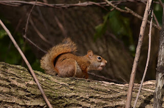 The beta red squirrel is a male, but I couldn’t tell about the other one yet. The alpha seems redder, and a bit more run-down, like it’s tired from all the time it spends defending the walnut from intruders. This morning I watched two gray squirrels (Sciurus carolinensis) stalk up to the tree, climb it and stealthily drop a couple of walnuts to the ground. As soon as the walnuts thudded loudly down, the red squirrel jumped to action and furiously chased the grays away. The grays sprinted down, hurriedly grabbed the two walnuts and then gleefully ran off together to cache them safely away. I was surprised to see them work together. I call the alpha the alpha because it’s the one that is king of the hill, or rather king of the walnut.
