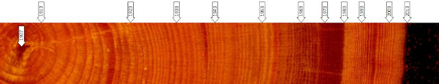 Enduring the summer means slooooow growth. I was out harvesting wood for coasters, and I found a giant old hemlock that had come down across Wool Pullery Brook in South Burlington. I cut the branch from the trees in the photos at the top (about 35′ from the trunk) right at the base where it came off of the tree (if the tree were still standing the branch would have been about 25′ up). Hemlocks are about the most shade tolerant species, and a single hemlock needle can live for up to 40 years (in part because it can deal with as little as 10% light and still photosynthesize enough for the plant to keep it around; for contrast, white pines are far less tolerant of shade and lose about half their needles each year).