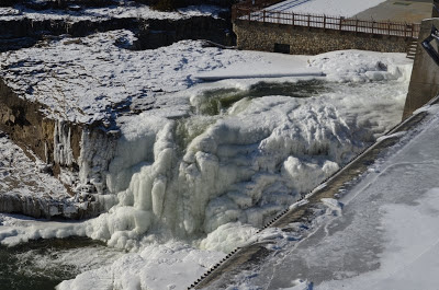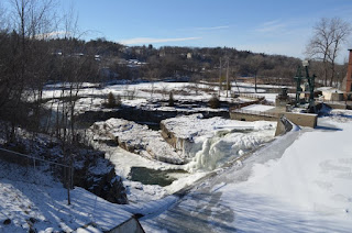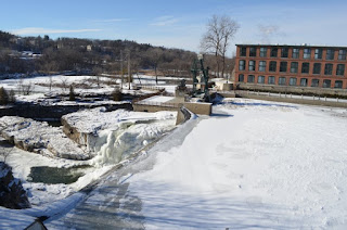 It’s full on winter (Happy coldest day of the year!) and to celebrate I thought I’d head down to the river to retake photos from the same perspective as I did during Irene. What a difference! Upstream there are a few patches that are open, and there’s a frozen waterfall. Somehow we’re faced with flood warnings once again; residents in Franklin Co. NY have even been evacuated.