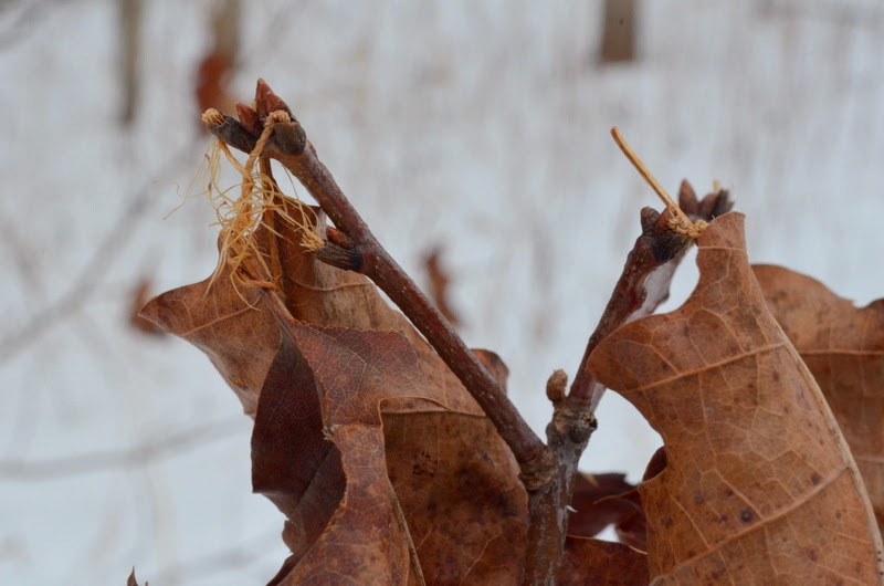 What: One of my students, Kaleigh Wood, posted about marcescence a couple of years ago. Marcescence, which is common in trees in the oak family, fagaceae (e.g. oaks and beeches), is the process in which the leaves die in the fall before the abscission layer completes the process of releasing the leaf from the tree. I think that these trees just have poor timing and cold weather kills the leave. Others suggest that the dead leaves help protect from the cold, water loss due to wind, or deer browse.