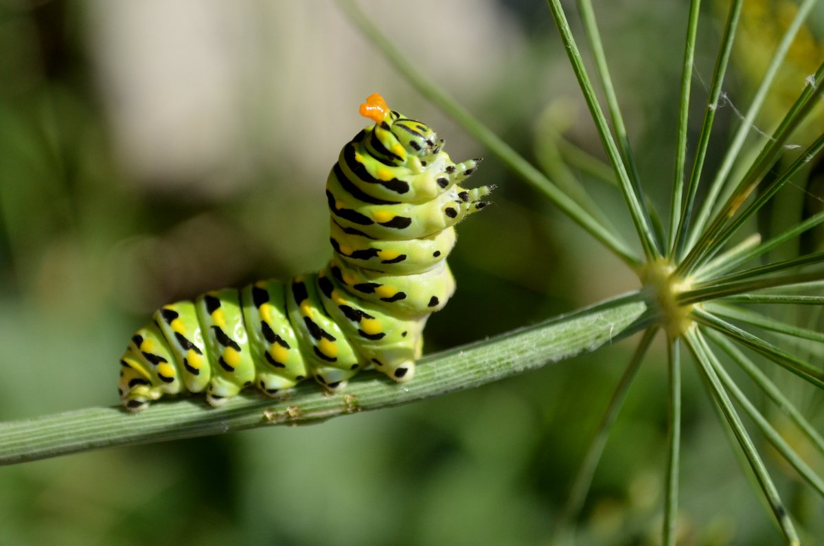What: Last night I spotted a black swallowtail caterpillar (Papilio polyxenes) on our dill. When I came back this morning it was still there, perched on the same delicate pedicel (fancy name for the stalk that connects a flower to the main stem of the plant) of the dill’s umbel (fancy name for an inflorescence [fancy name for a cluster of flowers connected by a central stalk to the main stem of the plant] where the flower stalks are of equal length and extend from a central point).