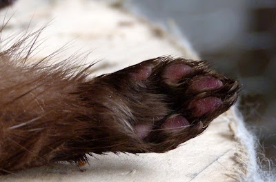 What: A friend up in Fairfield had a mink (Mustela vison) kill all of her chickens while she was away on vacation. Her neighbor’s dog subsequently killed the mink. I went up on Sunday to pick up the mink, which is in great shape, save a puncture on its back and snout. I see their tracks often, so it was great to get to look up close at their feet – you can actually see “fingerprints” on each of the toes! Like all members of the weasel family (Mustelidae), mink have five toes on both their front and rear feet. (insectivores also have the same number of toes but are considerably smaller). The toes are webbed maybe half way up the digit (mink are highly aquatic), and their toenails were incredibly sharp.