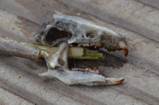 Ecological notes: I’ve found a few owl pellets recently, (coincidentally?) all at the base of old white pines. The last one I pried apart was on the small end of pellets, but still had one vole and one shrew skull in it. The shrew skull was beautiful – I’ve always been drawn to the purple on the enamel of the teeth (as in rodents, the color is due to an iron pigment). Rodents have iron pigments on their incisors and softer exposed dentine (our dentine is hidden beneath our enamel) to maintain a sharp chisel edge. Anemic rats have been found to lack the pigmentation on their incisors! Older scientific articles speculated that the coloration could have been used as a signal (making the teeth visible when the animal grins aggressively). I doubt that, as white is equally visible. In shrews, it could signal health (redder teeth means more virility, as red feathers indicate virility in male cardinals, flamingos, etc).