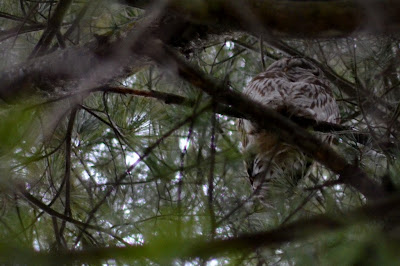What: On Saturday Nathan and I went for a wander in Centennial Woods. We were exploring the lower stretches of Centennial Brook in Fox Marsh when we heard some crows making a ruckus to our East. We decided to track down the birds and see what the fuss was all about. Turns out the crows were harassing a barred owl that seemed more interested in napping than paying attention to the crows. After about 15 minutes the crows left the owl at peace. It was interesting to watch the owl over then next 45 minutes or so because any time a crow flew nearby it would caw, just to remind the owl they knew it was there. We walked back to my house to get better binoculars and my camera and the owl was still there by the time we got back. I snapped a couple of pictures of the owl perched near the top of an old white pine.