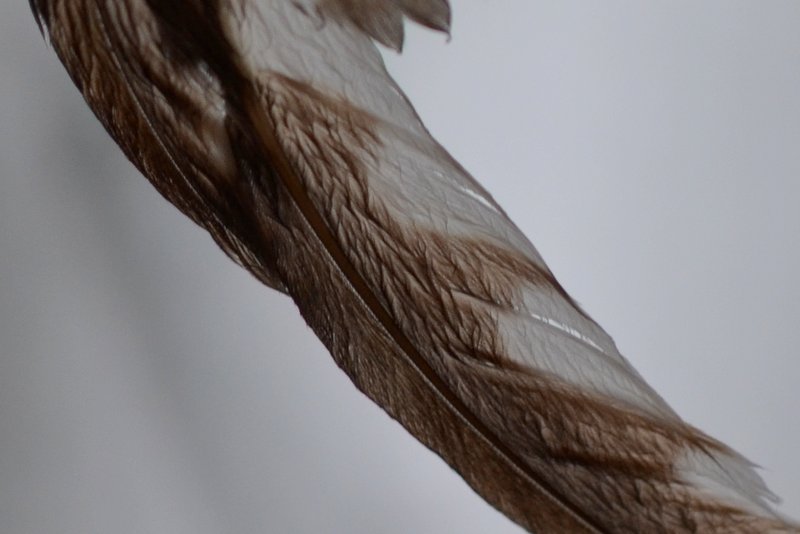 - The white bands on barred owl flight feathers cut straight across the feather. These were just white blotches on the trailing end of the feather.