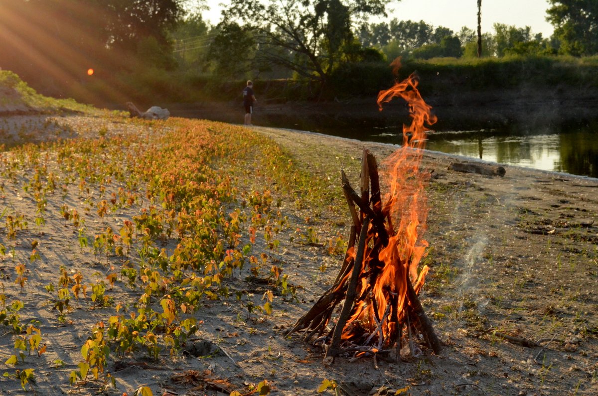 Other signs included debris lines of branches strewn along the banks at different heights and sand bars that were exposed on the downstream side of islands. One of my favorite signs was all the silver maple seedlings sprouting up at distinctly different terraces along the bank as in the photo above that shows two such terraces. My guess it that they correspond to two rain events. The upper “terrace” of seedlings being deposited first in a big rain storm. Rains could have washed loads of the seed crop into the river as it swelled. Seeds were deposited at the edge of the river, particularly on the inside of the river’s turn (called a point bar, or erosional area, as opposed to the outside of the turn where water moves quickest, called the cut bank; cut banks usually have steep slopes as opposed to the slow sloping banks of a point bar).