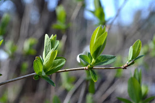 What: Leaves on Red elderberry (Sambucus racemosa), Tartarian honeysuckle (Lonicera tartarica), and Black cherry (Prunus serotina), respectively, bursting.
