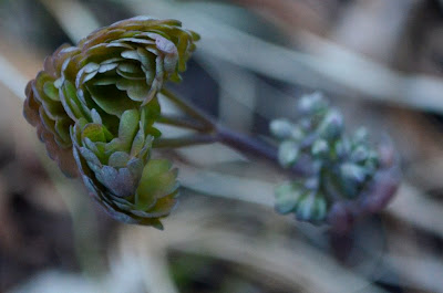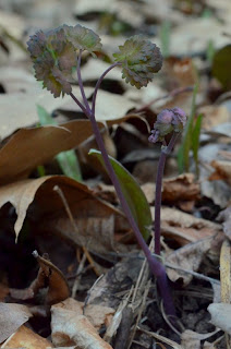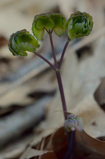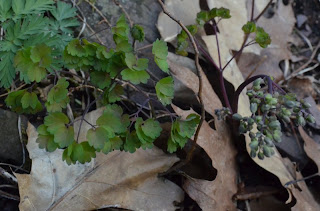 Ecological notes: Early meadow rue is superficially similar to blue cohosh (Thalictroides caulophyllum, thalictroides = thalictrum: thaliktron, Greek name for plant similar to meadow rue + -oides: resembling, looks like, so blue cohosh is the plant that looks like the plant that looks like an unknown plant that Dioscorides described in Greece). Blue cohosh looks like a beefed up, simplified meadow rue (I’ll post about blue cohosh soon). Besides the shapes of the two plants being similar, the most notable similarity is their color. Each emergent plant has a deep purple tint to it. As the plant unfurls, it loses this coloration. My guess would be that, as a tree’s leaf has yellows and oranges and other fall colors throughout the growing season, they don’t show these colors during the growing season as the density of green chlorophyll increases and overshadows other colors in the leaf.