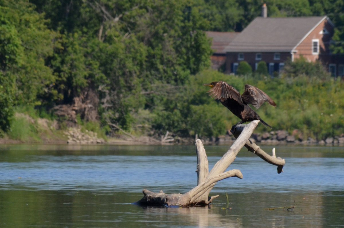 Ecological notes: I was particularly fascinated with the enormity and odd grace of the committee of turkey vultures that seemed to defy my cultural expectations of what a vulture should be (on Friday I’ll post more about collective nouns, like committee, for animals). Wednesday evening I came to a fork in the river where it split around an island. I saw a turkey vulture circling low on the south stretch of the island and so I set down that direction. As I slowly approached, another turkey vulture landed on a gravel spit about a quarter mile down from me, followed shortly by three more. I tied up my boat and crept slowly along the shore line to get a better view. As I rounded the bend I was treated with a spectacular view of about 25 turkey vultures either sunning themselves on the rocks or perched up in the trees preening themselves.