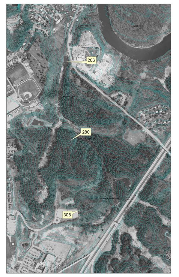 After doing some investigating, I ended up in the Map room of UVM’s library. There, I met with local map guru, Bill Gill. I asked him if he knew about these old markers in Centennial. He said no but that he does know a good deal of information about sea level elevation and topography so we sat down at a computer to look at some GIS mapping software. Using this program, Bill put together the image below to illustrate the topography of Centennial Woods. We honed in on Centennial Woods to look at this topographic overlay with a contour interval of two feet. Bill, being extremely proficient at GIS, picked out some key points to focus on. The point nearest the bottom of the image below is the start of the stream that runs through CW. Bill guessed that this is where the highest point is in CW at 308 feet above sea level. The uppermost point on the map at 206 feet above sea level indicates the lowest elevation downstream in CW while the middle point at 280 feet above sea level is a good reference point for the center of the woods. Where: Centennial Woods