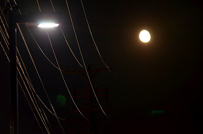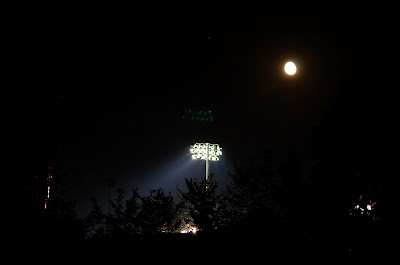 The moon is waning from our blue moon (the second full moon within a calendar month). And I found particular fondness for the moon’s waning bodice, which hummed a vibration softer and warmer than the cool glow of the electric lights presiding over the Lake Monster’s game. With a long shadow casting over my shoulder I snapped a few shots, impressed at the brightness of the moon, its details washed out in each photograph. Looking at the photos, I’m fascinated and intrigued by the patterns of distortion that come out, from the lens flares to the double image of the moon (above).