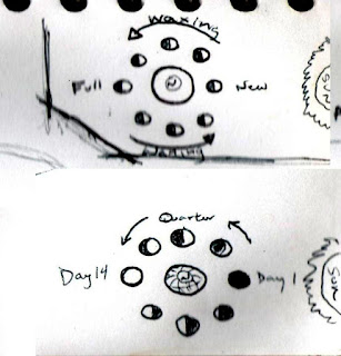 I drew the above to try and make sense of why we see the moon as different stages of fullness. So the circle in the center with an “N” in it is like a bird’s eye view of earth, looking down on the north pole (earth rotates counterclockwise around the sun and spins around its own axis counterclockwise). The same face of the moon is always facing the earth.