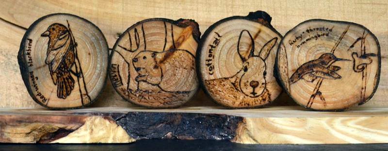 What: Julia and I had craft night on Wednesday (not different from most nights), and I finally made some good progress on a project I started a few months back. Back in the fall I had gotten a bunch of aspen logs that had been cut along the bike path. I cut it into disks (about 3″ diameter) and have been drying it along with sections from beech, white birch, hemlock, and yellow birch. For the disks I wanted to translate photos I’ve taken into woodburnings of animals that live in and around the beaver pond in Centennial Woods. Last night I made the above disks. I’ve already finished a chickadee, chipmunk, eastern newt, and mink. I still have the following: great blue heron, honeybees, and wood frog.