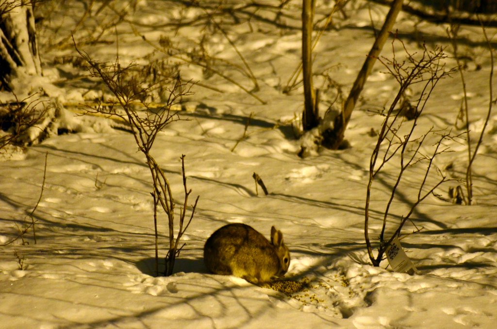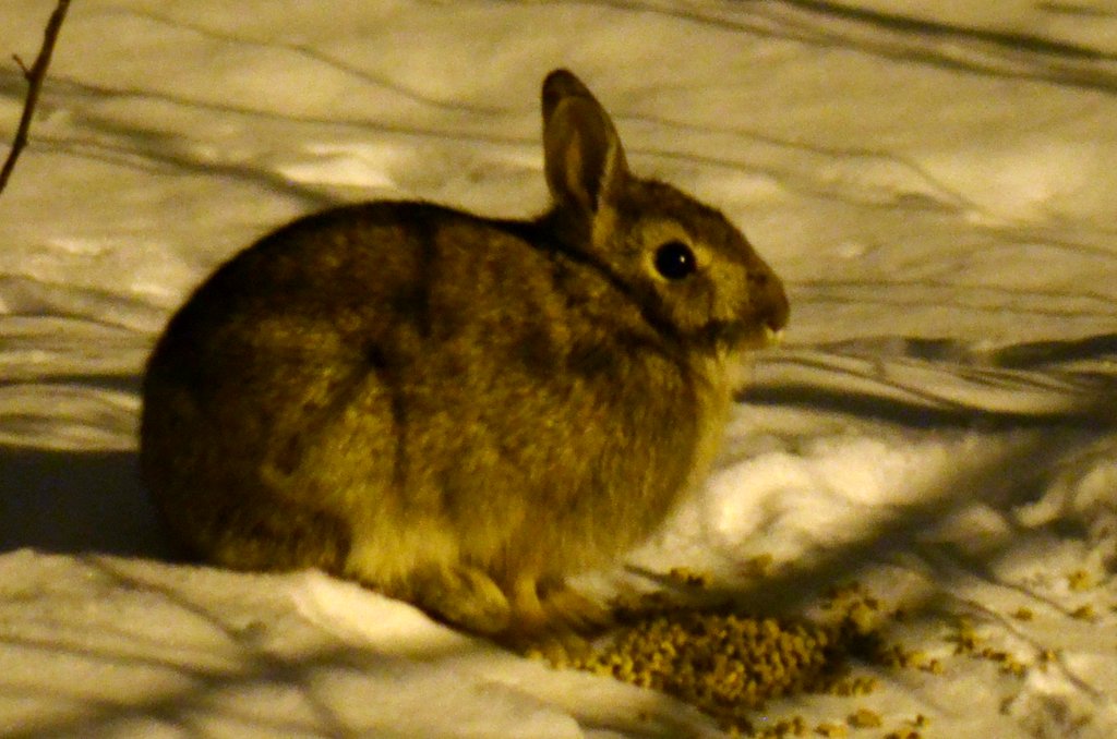 What: A couple nights ago, Meryl, Julia, Brian and I were watching a couple of eastern cottontails chasing each other ferociously around in my backyard. For the 3 or so minutes we watched, one was definitely the pursuer. They would sprint for short periods followed by great acrobatic displays with one or both jumping straight into the air. Their breeding season is March through September, so this might be an early start on staking out breeding territory, a mating ritual between a male and a female, or it could be a late winter food-shortage spat. I’d only ever seen one rabbit at a time in my backyard so I didn’t realize that their territories overlapped. I have no idea of gender, nor is there a reliable way of telling without having the animal in hand.
