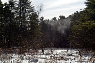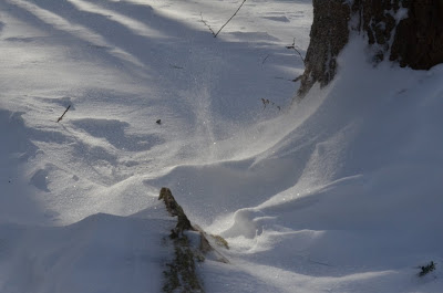 The dryness of the snow meant that by late morning almost all the snow had come down off the deciduous trees and conifers that weren’t sheltered by other conifers. I tried to capture the grace of snow clouds drifting whimsically through the woods but couldn’t quite get it. I think it needed video.