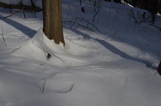 What: I went for a walk with Jon yesterday and while there was certainly a lot of snow on the ground, almost all of the snow in the trees had come down. I started thinking about all of the other ways I might observe wind. I was at Rock Point Friday night and by Saturday morning the winds had picked up and cleared out the thin layer of slush in Little Eagle Bay (what we call Mink Bay) and replaced it with stacks of ice plates. The winds picked up all day and by the afternoon they were stinging our noses. Because of the cold, the snow was “dry”. But the wind had dried the snow right up, and sure enough it slid right off of railings, my car, and anything else it was perched unto.