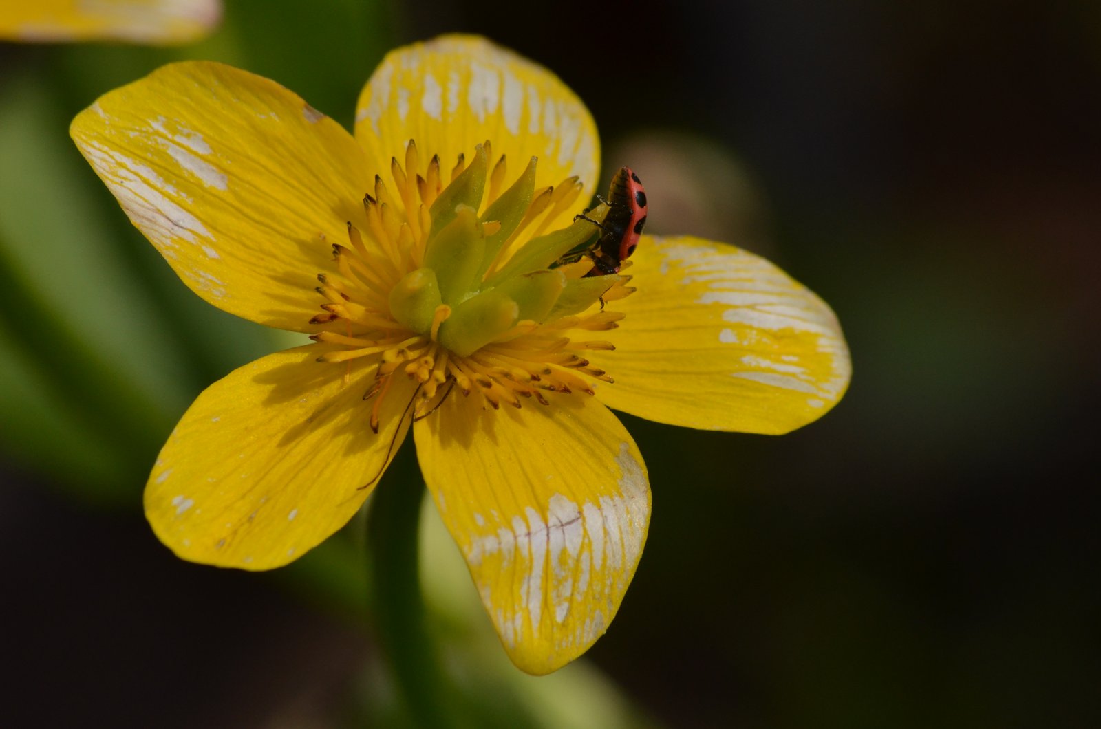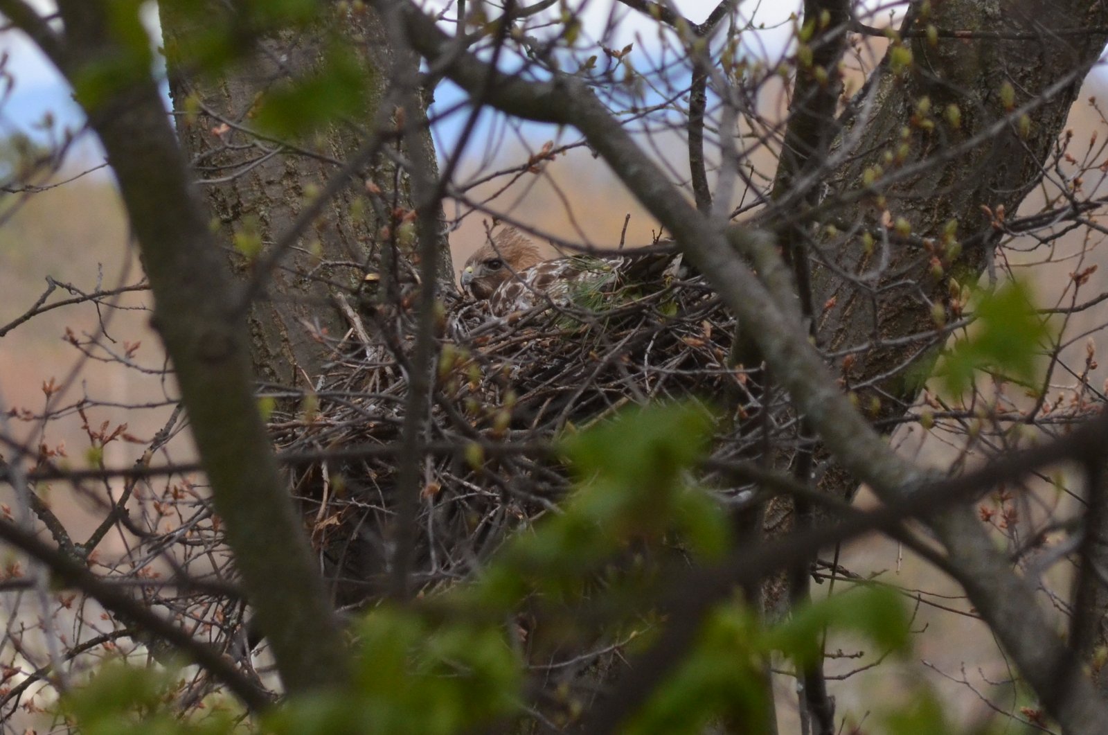 Ecological notes: This is more of a photo essay, but I was impressed with the number of flying insects out and about. Just as I arrived, Patty, who works at the detention center, tipped me off to a red-shouldered hawk nest. The hawk wasn’t on the nest so I walked the loop first. The spring ephemerals were out in abundance – trout lily, marsh marigold, stinking benjamin, large-flowered trillium, bloodroot, wood anemone, and a few others. So were the insects. I noticed that a duskywing (skipper family based on the curved knob at the tip of the antennae, but couldn’t ID to species) was “mobbing a morning cloak” which was interesting. Each time the mourning cloak got near the skipper chased it off. Birds do it, why not butterflies (probably because other butterflies aren’t predators on caterpillars)?