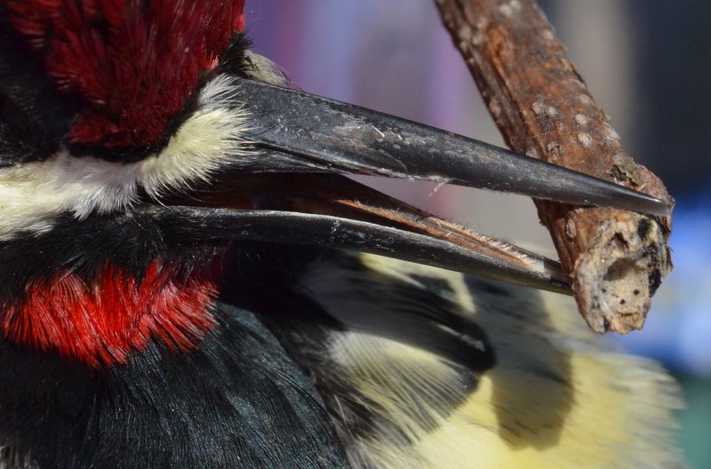 What: One of my students found a yellow-bellied sapsucker (Sphyrapicus varius) that had died near her house (no sign of predation, perhaps flew into a window). The next day we got to watch a sapsucker drilling holes in a bitternut hickory (Carya cordiformis) and licking out the sap. I propped open the bird’s mouth with an elderberry twig to show the bristles that line the tongue. Birds can’t “suck” like we can from a straw, so having the hairs allows the woodpecker to lick up much more sap than a smooth tongue would be able to. The hairs work via capillary action, which is the ability of water and other liquids to overcome the force of gravity via intermolecular attractive forces to solids. This can be seen readily by holding the tip of a napkin in water and watching the water travel up the napkin. So all that surface area acts as a magnet of sorts and the little birdie can lap up even more liquid.